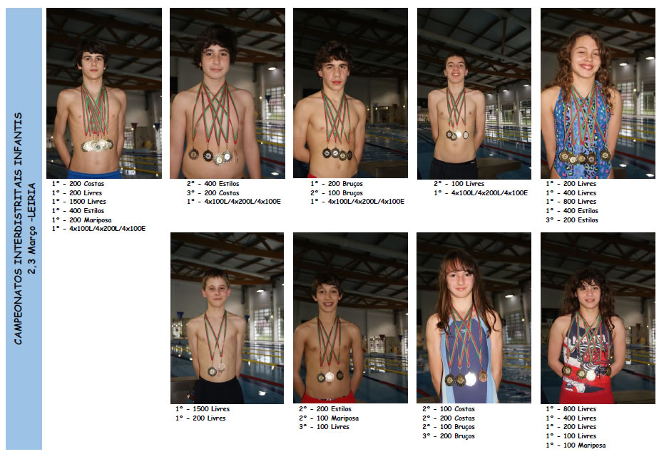Em termos individuais as suas prestações renderam 8 medalhas, com relevo para as obtidas na prova de 100 Mariposa e 200 Estilos pela nadadora Sara Alves (Inf B), e na prova de 200 Estilos pelo nadador Gabriel Gomes (Inf A). Em 2º lugar ficou ainda a Maria Costa, Junior nas provas de 100 Livres e 100 Costas e a Ana Reis (Inf A) nos 100 Mariposa e 200 Estilos. A atleta mais jovem da comitiva presente neste mítico Meeting que decorreu no Estoril, Sara Alves conquistou a 3ª medalhas ao ficar em 3º lugar na prova de 100L, participando ainda nesta competição que se realizou em jornada dupla, Leandro Mota e Ana Mafalda Duarte.